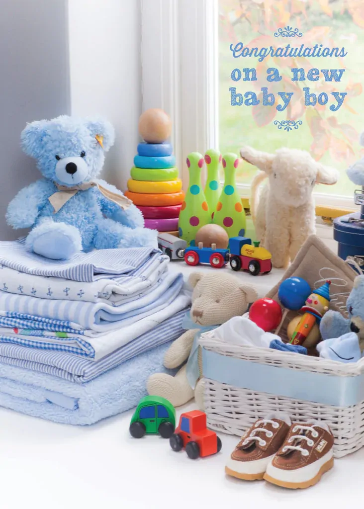 Description: A Baby Boy Card from the Classic range by Leonard Smith. The card measures 120x170mm and comes with a bright white envelope.