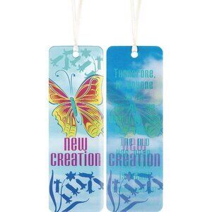 Description: Colorful lenticular bookmark displays a butterfly theme with a butterfly and scripture related to a new creation; 5cm by 15cm height; gives the illusion of being 3-dimensional.
