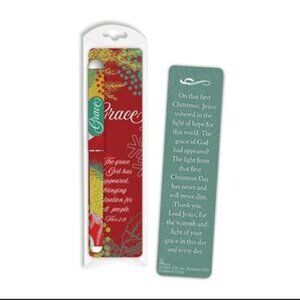 Description: Christmas themed bookmark and pen set, ready-to-give to gift as a small reminder of the reason for the season. Bookmark is 1.5" x 6" with coordinating black ink pen with ball clip. Packaged in acrylic box with gold stretch loop cord.