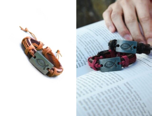Beautiful leather adjustable bracelet with metal Christian fish symbol attached.