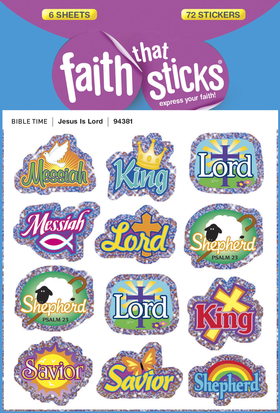 Description: These stickers are a fun way to teach boys and girls the names of Jesus. Foil-edged with colorful Christian symbols, these stickers feature names of Jesus from the Bible, including Messiah, King, Lord, Shepherd, and Savior. Approximately 1" x ¾". Six sheets, 12 per sheet; 72 stickers per package.