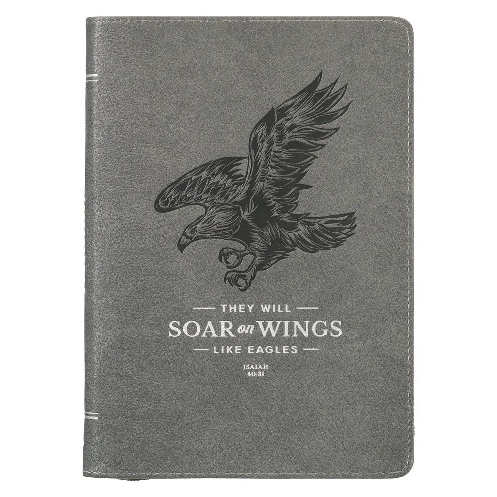 Description: Discover the perfect companion for your morning devotions or nightly journal sessions with the Wings Like Eagles Steel Gray Faux Leather Journal with Zipper Closure. This journal offers a serene and calming design, creating an atmosphere of tranquility as you delve into its pages. Its encouraging sentiment and uplifting message will inspire and renew your spirit as you ponder its meaning.